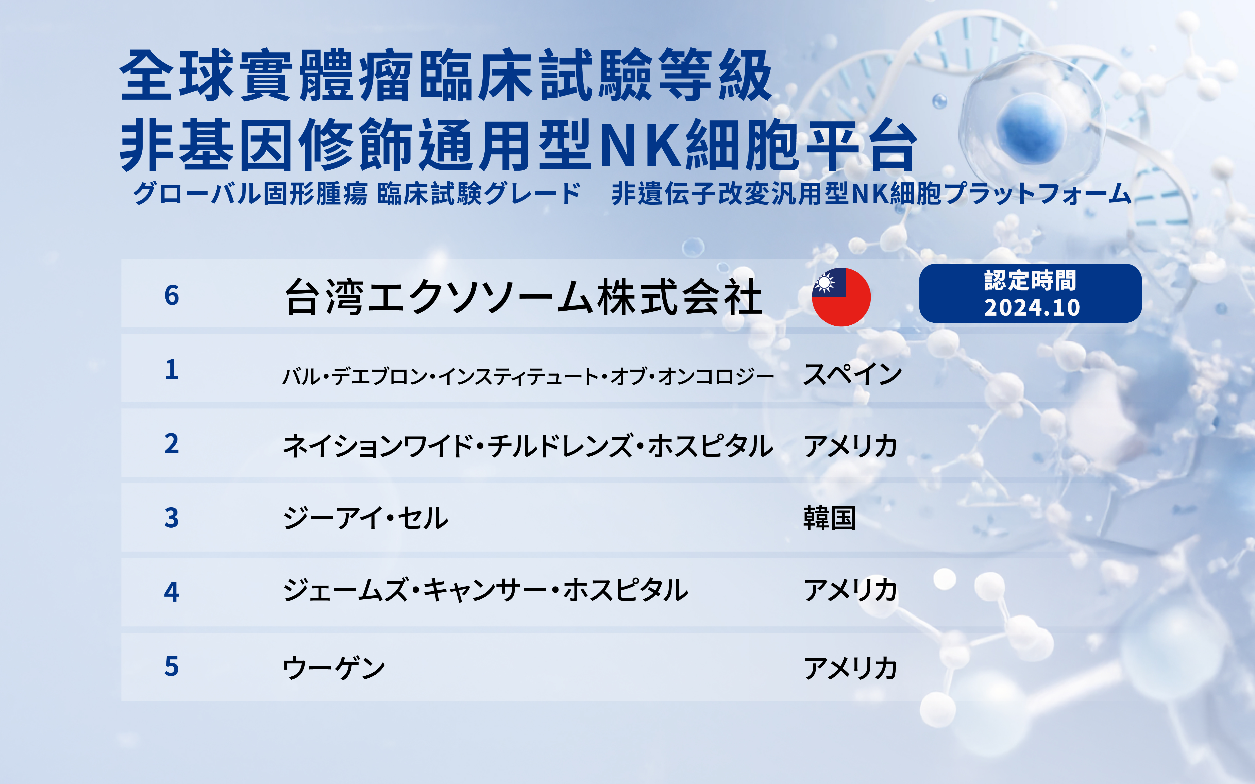 | 「台灣外泌體公司為國內首家臨床等級通用型(非配對與非基因修飾)NK細胞平台是公司技術布局的重要里程碑,展現我們在製備、研發與臨床接軌上的整合能力。未來我們將持續深化與國際臨床單位合作,加速推進外泌體與免疫細胞平台的應用研究,進一步提升台灣在全球再生醫療領域的參與度。」 | 「当社が国内初の臨床グレード汎用型(非マッチング・非遺伝子改変)NK細胞プラットフォームを確立したことは、技術ロードマップにおける重要なマイルストーンであり、製造・研究開発・臨床接続における統合能力を示すものです。今後も国際的な臨床機関との連携を深化させ、エクソソームおよび免疫細胞プラットフォームの応用研究を加速し、台湾のグローバル再生医療領域への関与を一段と高めていきます。」 |